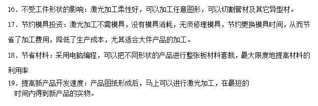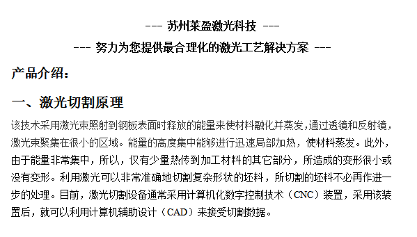 該技術(shù)采用激光束照射到鋼板表面時(shí)釋放的能量來(lái)使材料融化并蒸發(fā),通過(guò)透鏡和反射鏡,激光束聚集在很小的區(qū)域。能量的高度集中能夠進(jìn)行迅速局部加熱,使材料蒸發(fā)。此外,由于能量非常集中,所以,僅有少量熱傳到加工材料的其它部分,所造成的變形很小或沒(méi)有變形。利用激光可以非常準(zhǔn)確地切割復(fù)雜形狀的坯料,所切割的坯料不必再作進(jìn)一步的處理。目前,激光切割設(shè)備通常采用計(jì)算機(jī)化數(shù)字控制技術(shù)(CNC)裝置,采用該裝置后,就可以利用計(jì)算機(jī)輔助設(shè)計(jì)(CAD)來(lái)接受切割數(shù)據(jù)。